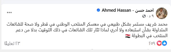 وأكد أحمد حسن عبر حسابه الشخصي على “فيسبوك”: "محمد شريف مستمر بشكل طبيعي في معسكر المنتخب الوطني في قطر ولا صحة للشائعات المتداولة بشأن استبعاده ولا أدري لماذا تثار تلك الشائعات في ذلك التوقيت بدلا من دعم المنتخب في البطولة".