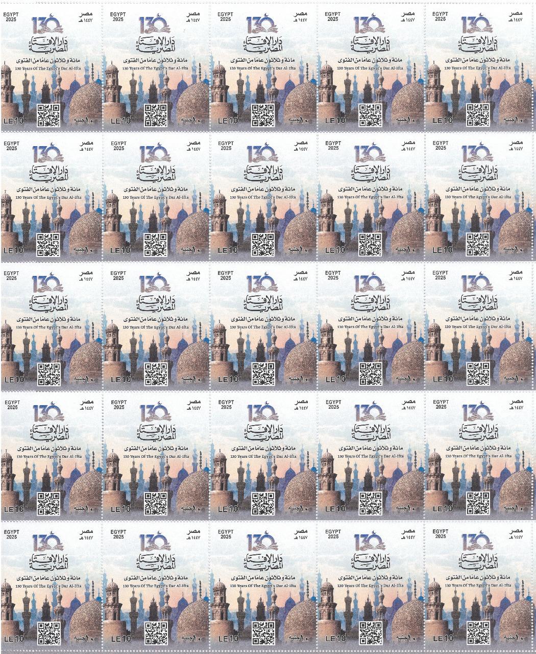 أصدرت الهيئة القومية للبريد طابع بريد تذكاريًّا؛ احتفاءً بمرور 130 عامًا على تأسيس دار الإفتاء المصرية، وتوثيقًا لهذا الحدث المهم، وإبرازًا للدور التاريخي والعلمي الذي قامت به دار الإفتاء منذ إنشائها عام 1895 في خدمة علوم الشريعة وترسيخ منهج الوسطية.
