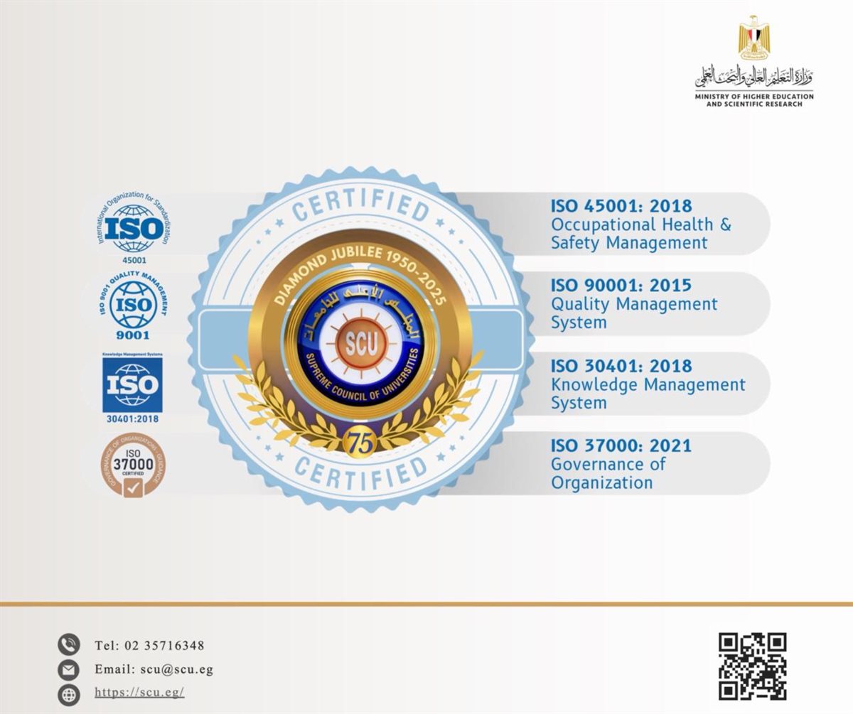 أكدت أمانة المجلس الأعلى للجامعات التزامها بتبني معايير الجودة العالمية، وحصولها أربعة شهادات للمطابقة الدولية (الأيزو)، ويُعد هذا الإنجاز تتويجًا لجهود التطوير الشامل التي تمت بالتعاون مع معهد التخطيط القومي.