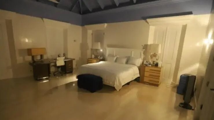 وتظهر اللقطات عدة غرف نوم في منزل إبستين بجزر فيرجن الأمريكية، إلى جانب غرفة تحتوي على أقنعة معلقة على الجدار وهاتف مكتوب على أزراره أسماء للاتصال السريع.