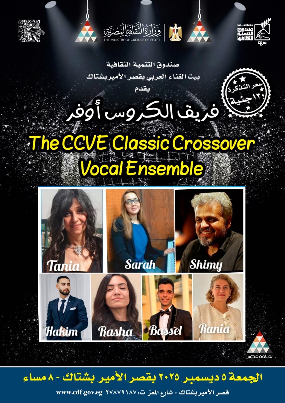 The CCVE – Classic Crossover Vocal Ensemble، وذلك في تمام الثامنة من مساء غد الجمعة الموافق 5 ديسمبر الجاري، وذلك في إطار استراتيجية صندوق التنمية الثقافية الهادفة إلى إتاحة تجارب فنية متنوعة، ودعم الفرق الشابة والمواهب الواعدة في مختلف مجالات الفنون.