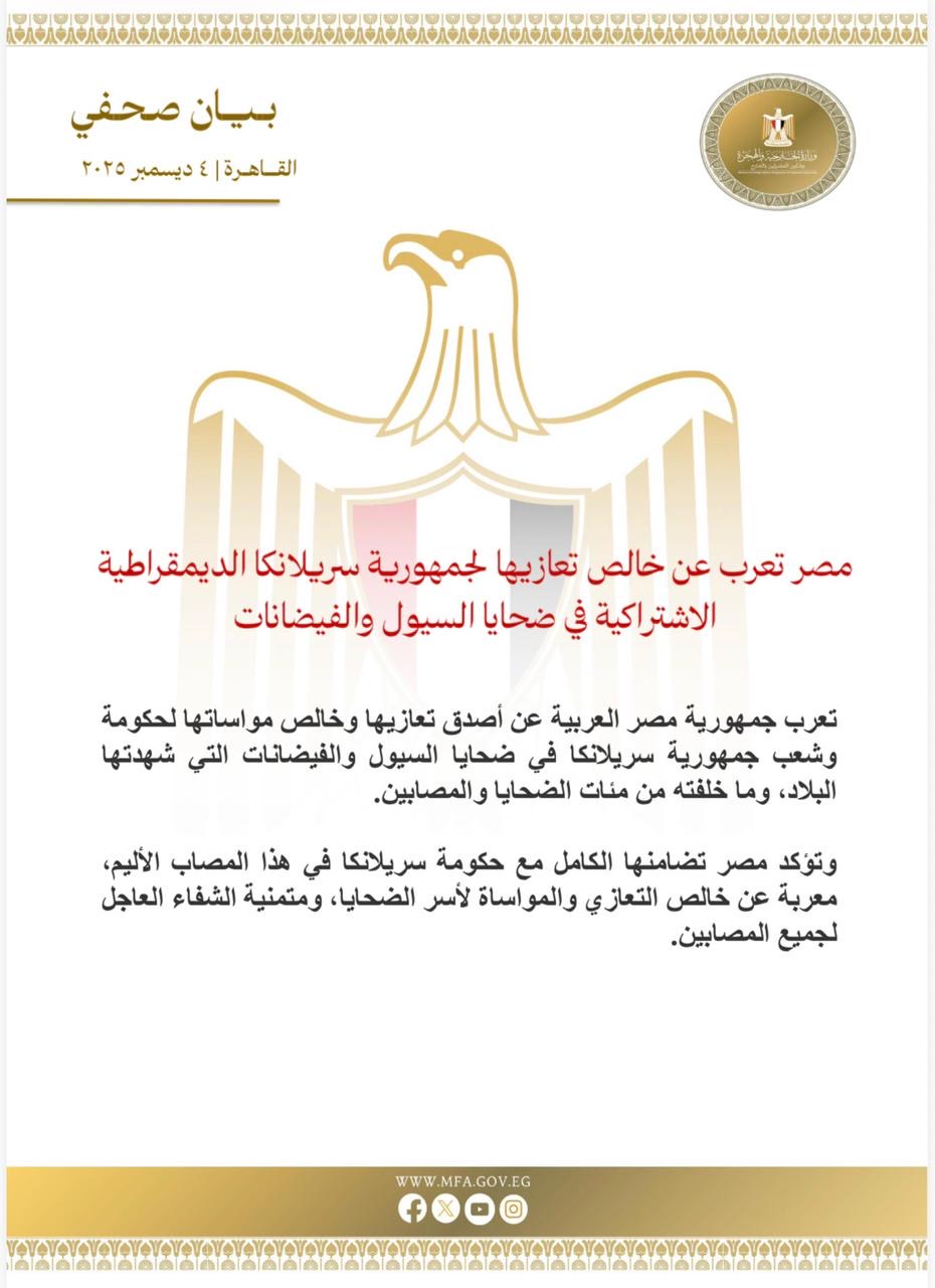 تعرب جمهورية مصر العربية عن أصدق تعازيها وخالص مواساتها لحكومة وشعب جمهورية سريلانكا الصديقة في ضحايا السيول والفيضانات التي شهدتها البلاد، وما خلفته من مئات الضحايا والمصابين.