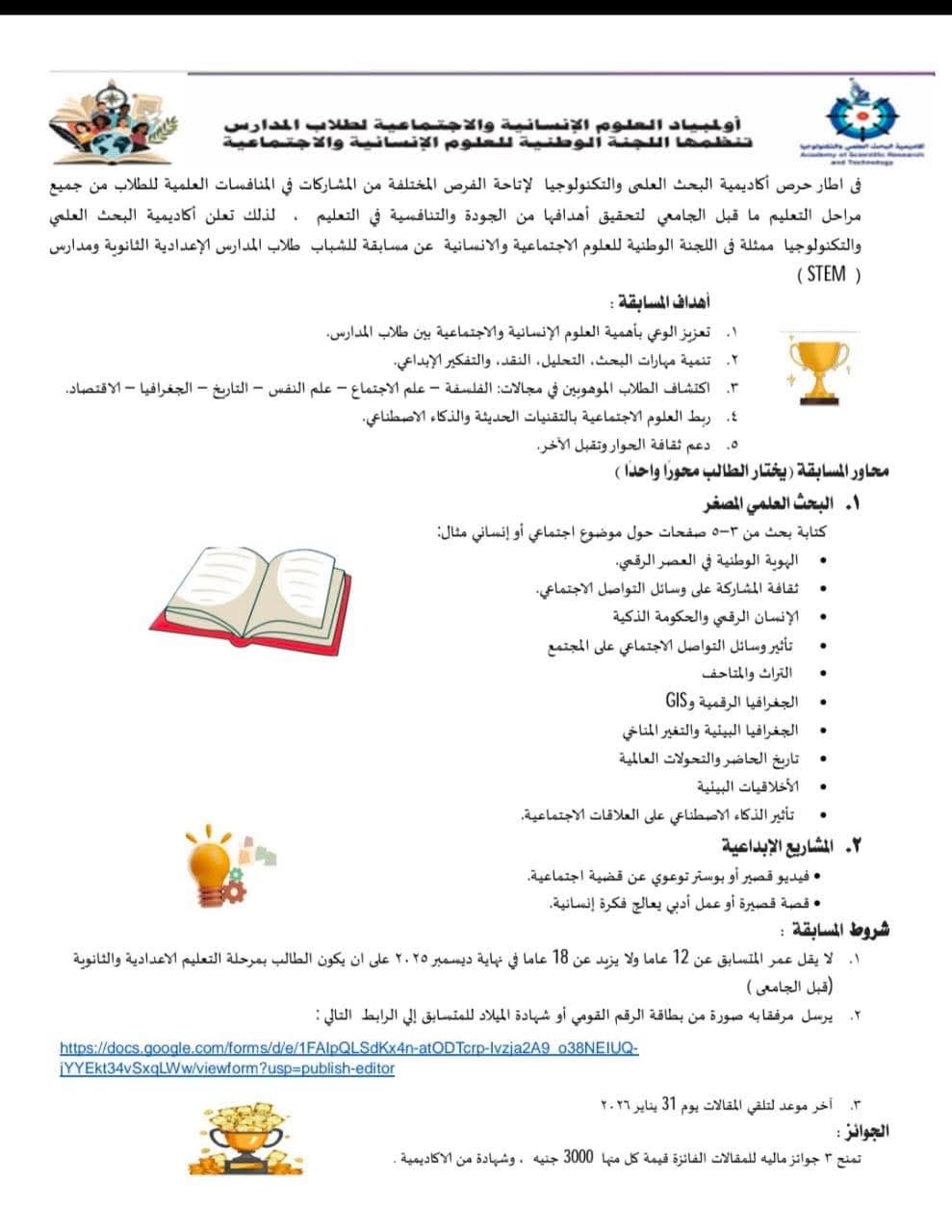 أعلنت أكاديمية البحث العلمي والتكنولوجيا ممثلة في اللجنة الوطنية للعلوم الاجتماعية والإنسانية عن فتح باب التقدم للمشاركة في أولمبياد العلوم الإنسانية والاجتماعية لطلاب المدارس الإعدادية والثانوية ومدارس STEM.