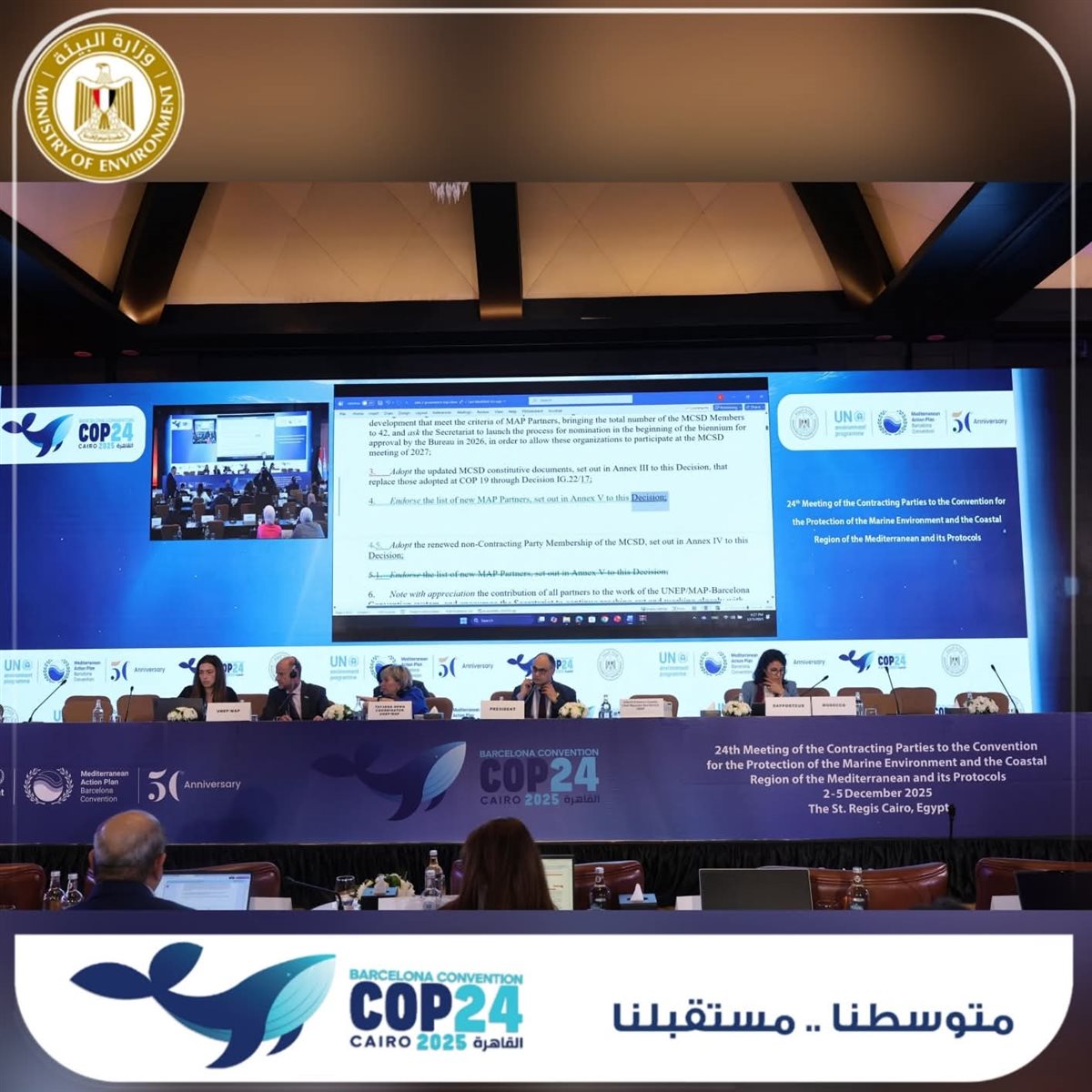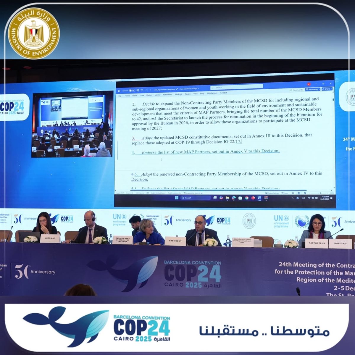 وأعلنت وزيرة التنمية المحلية والقائمة بأعمال وزير البيئة الدكتورة منال عوض فوز مصر برئاسة المكتب التنفيذي لاتفاقية برشلونة لمدة عامين، بالإضافة إلى رئاستها لاجتماع COP24، مؤكدة أن هذا الاختيار يعكس الثقة الدولية بدور مصر القيادي في القضايا البيئية وحماية النظم الساحلية.