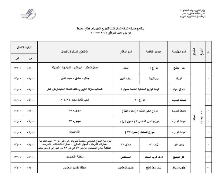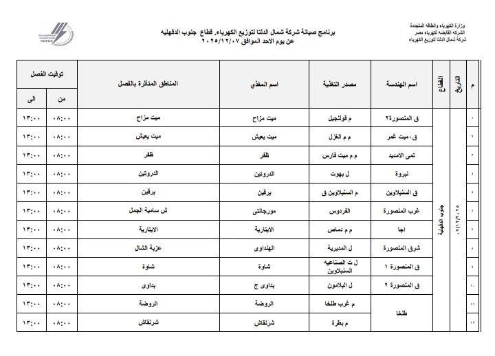 أعلنت شركة شمال الدلتا لتوزيع الكهرباء، انقطاع التيار الكهربائي، عن بعض المناطق بمحافظات “الدقهلية - كفر الشيخ - دمياط”، اليوم الأحد، 7 ديسمبر 2025م.