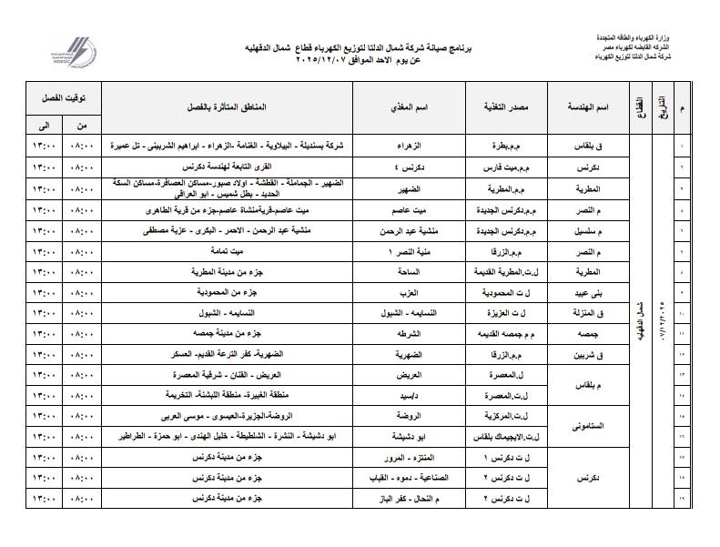 المناطق المتأثرة بفصل الكهرباء في محافظة الدقهلية جاءت كالتالي: