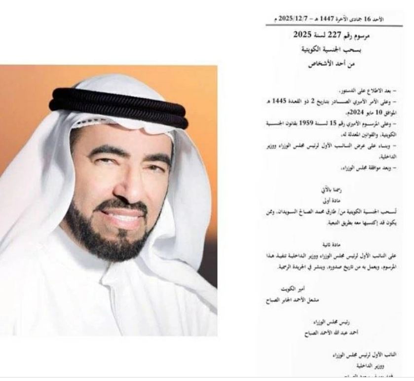 وجاء في المرسوم الصادر عن “قصر السيف”، والموقّع من أمير البلاد الشيخ مشعل الأحمد الصباح، أنه بناءً على عرض النائب الأول لرئيس مجلس الوزراء ووزير الداخلية، وبعد موافقة مجلس الوزراء، تقرر سحب الجنسية الكويتية من طارق محمد الصالح السويدان، ومن اكتسبها معه بطريقة التبعية.