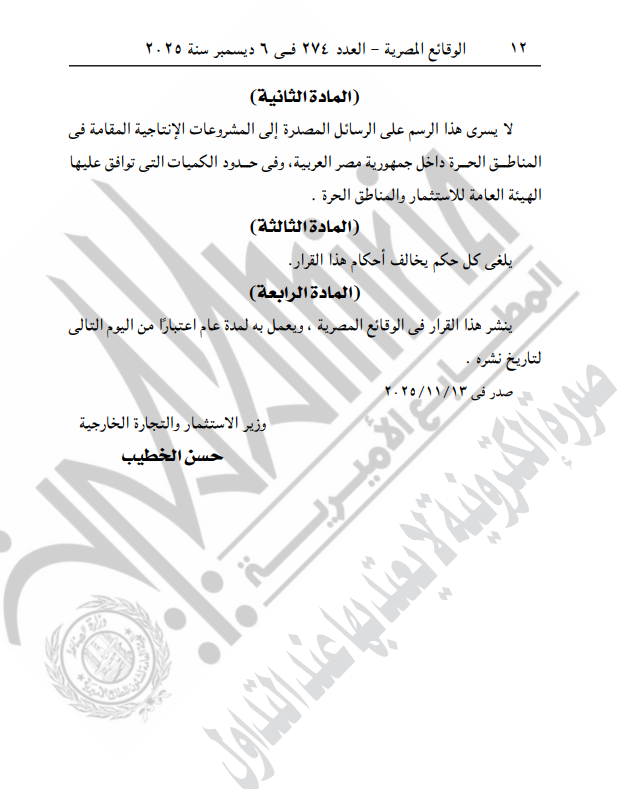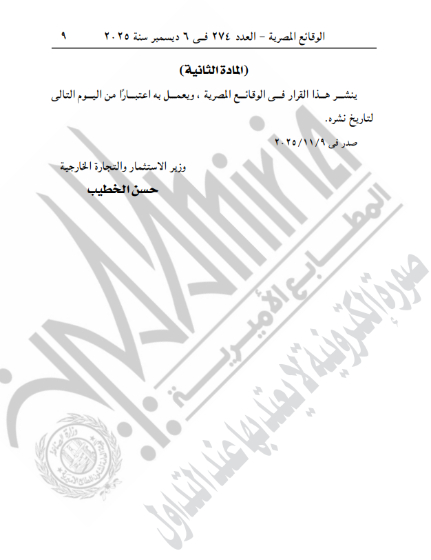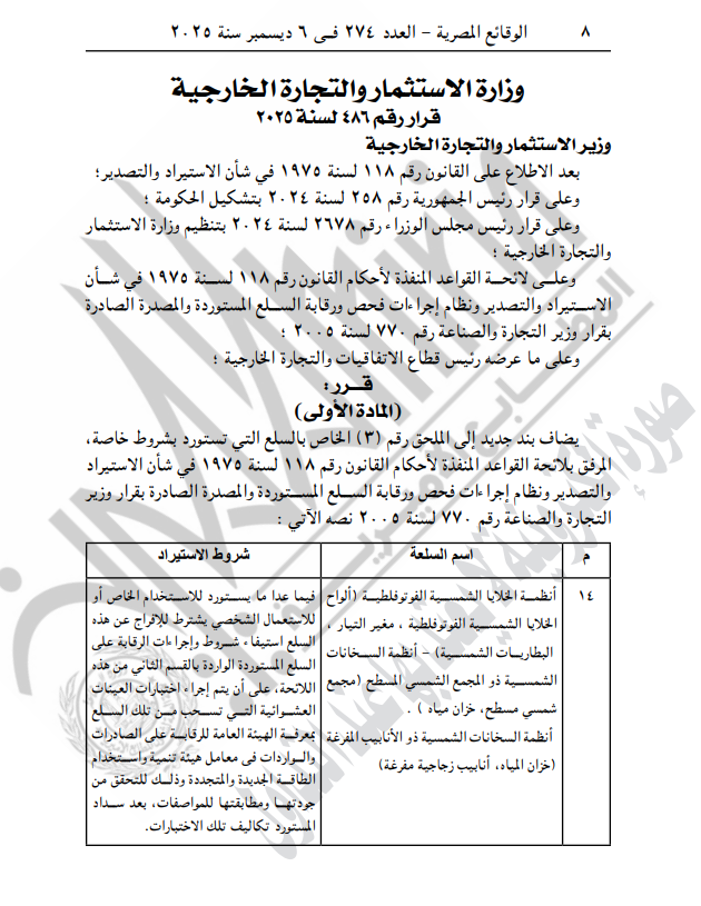 نشرت جريدة الوقائع المصرية في عددها رقم 274، الصادر في 6 ديسمبر 2025، قرارين جديدين لوزارة الاستثمار والتجارة الخارجية، بشأن استمرار فرض رسم صادر على صادرات بعض أصناف مكونات الأعلاف، وشروط جديدة لاستيراد السلع ومنها أنظمة الخلايا الشمسية الفوتوفلطية