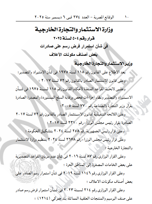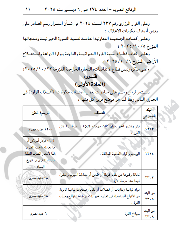 -قرار وزارة الإستثمار والتجارة الخارجية رقم 504 لسنة 2025، بشأن استمرار فرض رسم صادر على صادرات بعض أصناف مكونات الأعلاف، بفرض 1200 جنيه على القش وقشور الحبوب وإن كانت مهمشة (تبن)، فيما عدا قش الأرز.