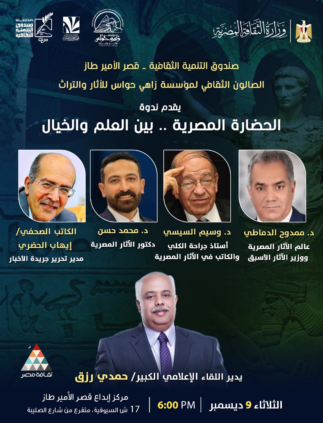 يقيم مركز الإبداع الفني بقصر الأمير طاز بالخليفة، التابع لقطاع صندوق التنمية الثقافية برئاسة المعماري حمدي السطوحي، وبالتعاون مع مؤسسة زاهي حواس للآثار والتراث، ندوة جديدة من الصالون الشهري بعنوان: "الحضارة المصرية.. بين العلم والخيال" وذلك في السادسة مساء الثلاثاء الموافق 9 ديسمبر.