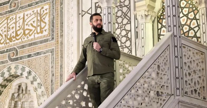الشرع يظهر ببدلة عسكرية في المسجد الأموي