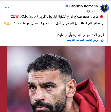وكتب فابريزيو رومانو، خبير الميركاتو، على حسابه بشبكة "فيسبوك": "عاجل.. محمد صلاح خارج قائمة نادي ليفربول ولن يسافر مع الفريق إلى إيطاليا لمباراة دوري أبطال أوروبا ضد إنتر".