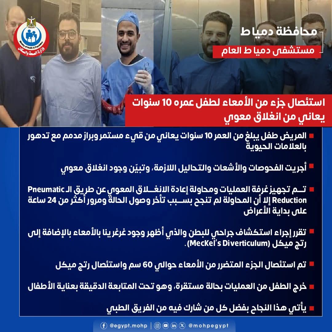كما نجح الفريق الطبي بمستشفى دمياط العام في إنقاذ طفل يبلغ من العمر 10 سنوات كان يعاني من قيء مستمر وإمساك شديد يصاحبه براز مدمم، مع ظهور علامات واضحة لتدهور حالته الصحية.