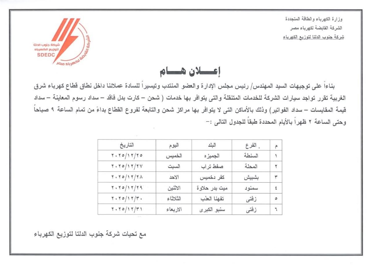 أعلنت شركة جنوب الدلتا لتوزيع الكهرباء عن توفير سيارات للشركة لتقديم خدمات متنقلة، والتي يتوافر بها خدمات «شحن - كارت بدل فاقد - سداد رسوم المعاينة - سداد قيمة المقايسات - سداد الفواتير».