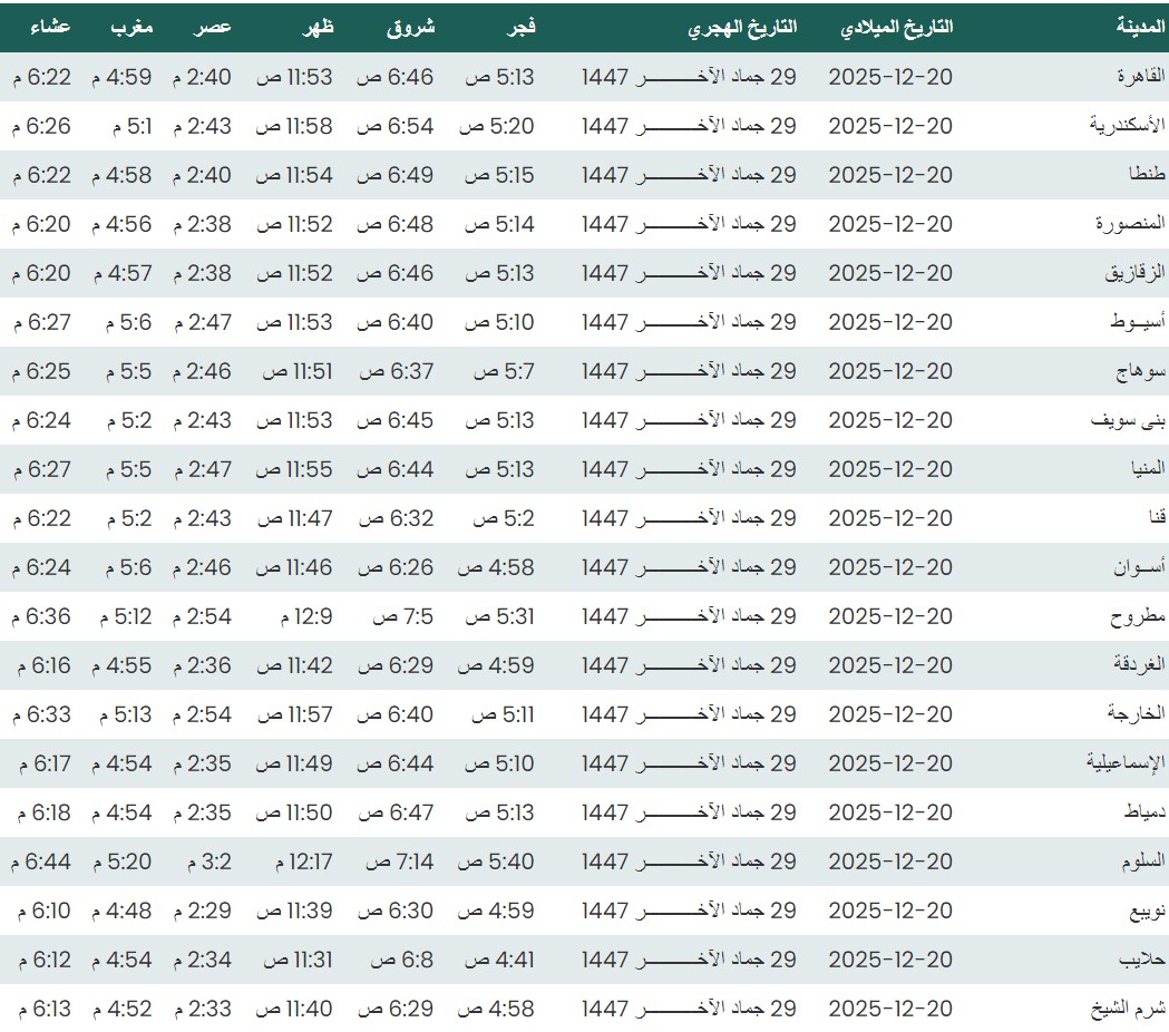 مواقيت الصلاة، موعد أذان الفجر اليوم السبت 20 - 12 - 2025 في القاهرة والمحافظات