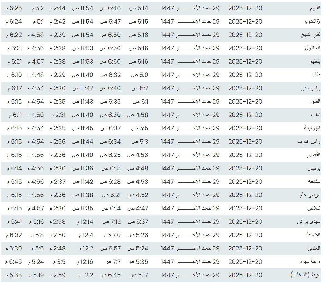 وفيما يلي مواقيت الصلاة، لعدد من مدن ومحافظات الجمهورية من واقع بيانات الهيئة العامة للمساحة