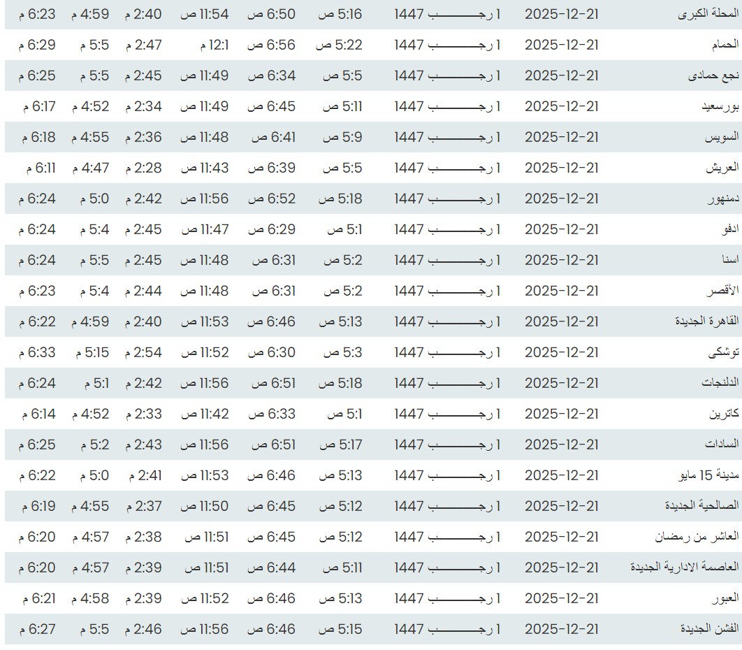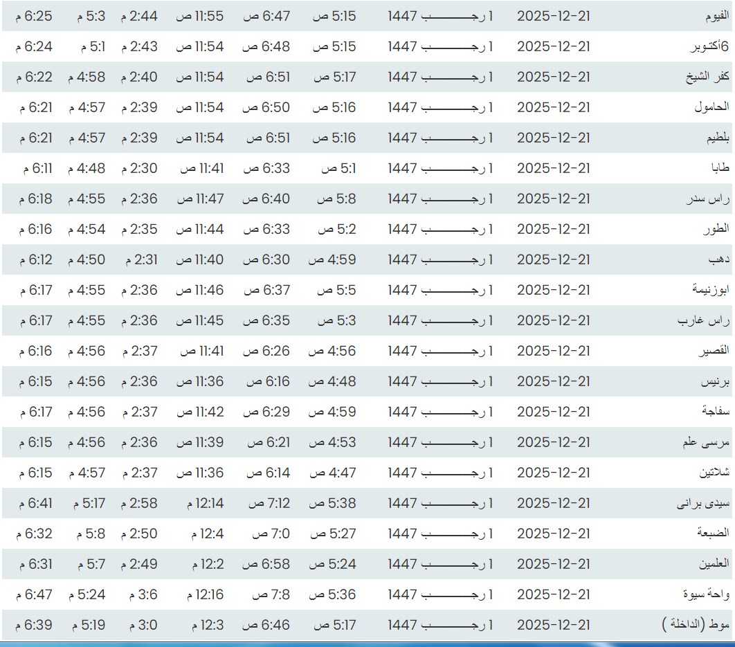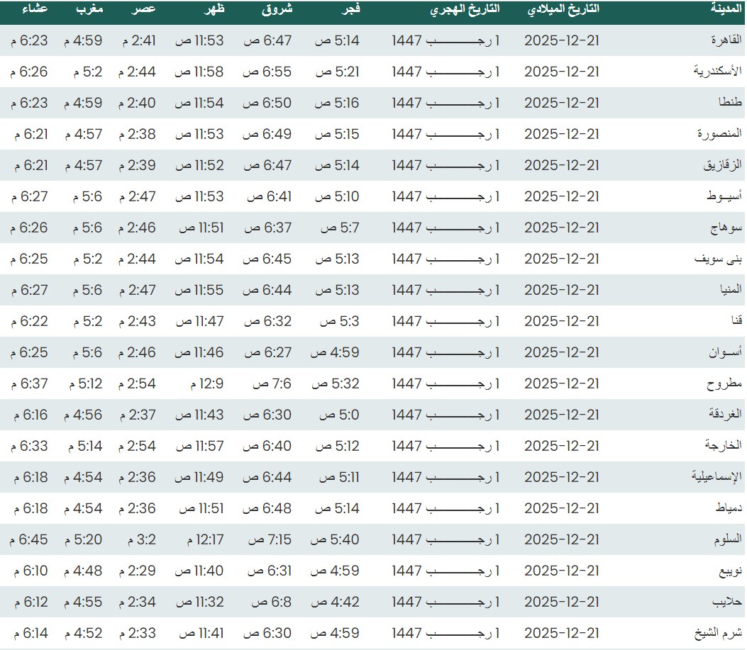 وفيما يلي مواقيت الصلاة، لعدد من مدن ومحافظات الجمهورية من واقع بيانات الهيئة العامة للمساحة