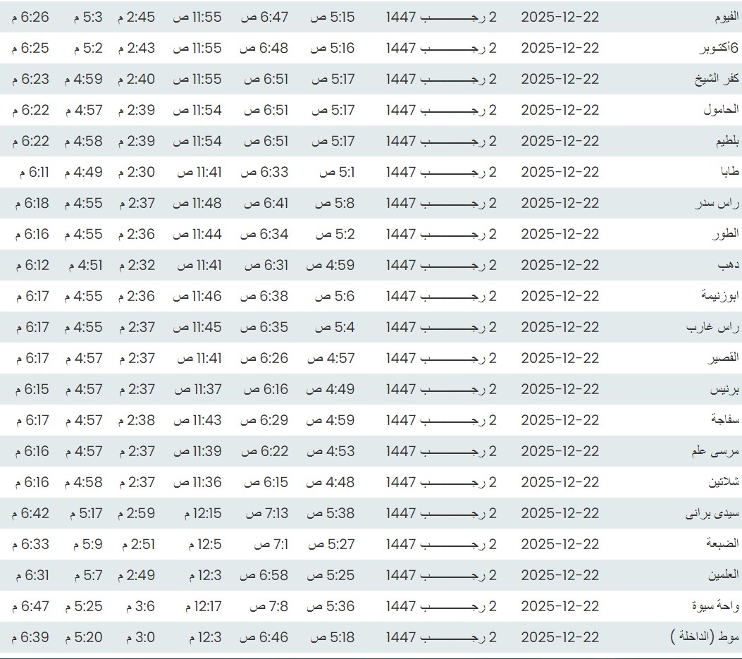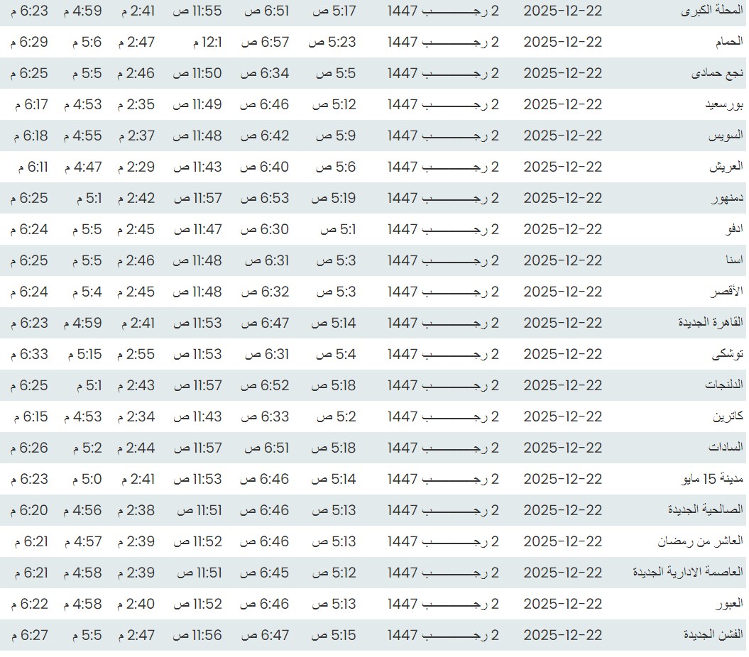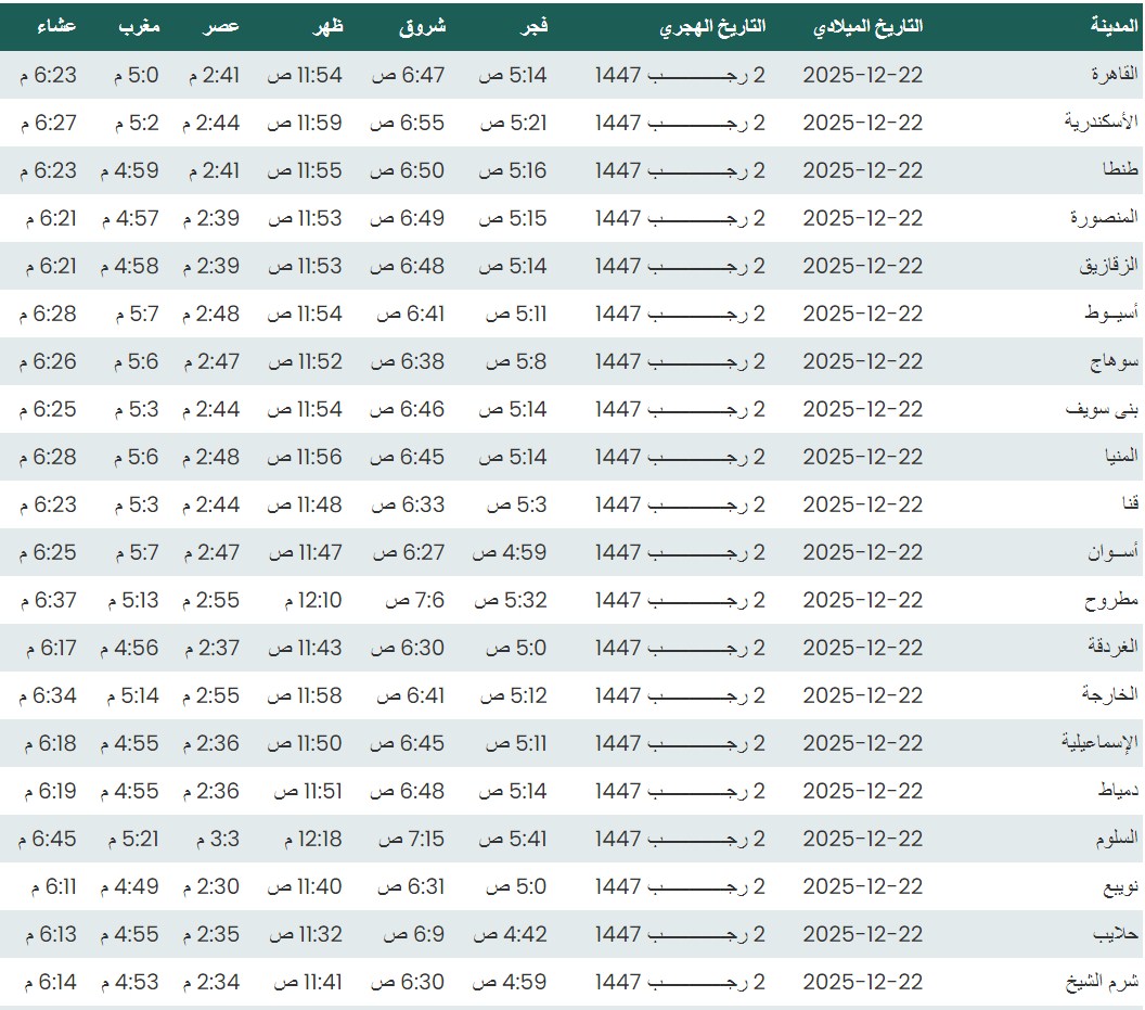 وفيما يلي مواقيت الصلاة، لعدد من مدن ومحافظات الجمهورية من واقع بيانات الهيئة العامة للمساحة