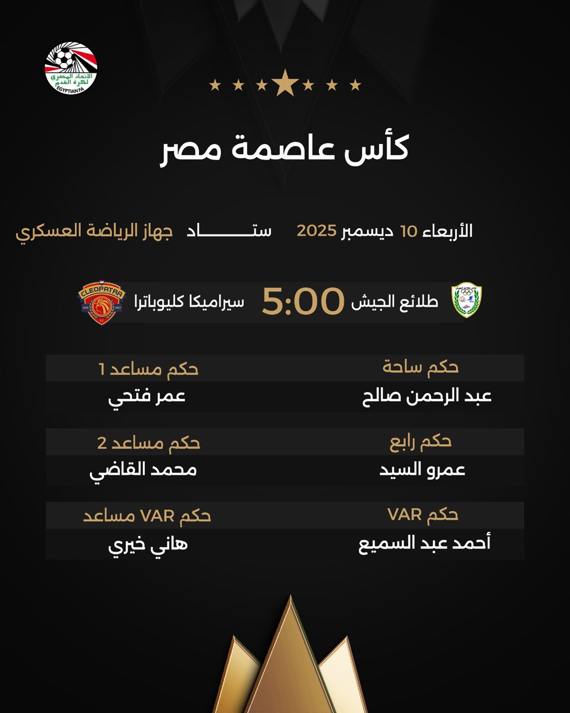 ويضم طاقم تحكيم مباراة سيراميكا وطلائع الجيش كل من: