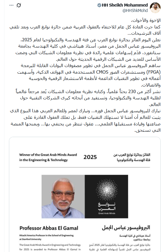 وقال الشيخ محمد بن راشد آل مكتوم، عن فوز البروفيسور المصري عباس الجمل بجائزة نوابغ العرب: "كما جرت العادة، كل عام للاحتفاء بالعقول العربية ضمن جائزة نوابغ العرب وبعد تلقي آلاف الترشيحات… نعلن اليوم الفائز بجائزة نوابغ العرب عن فئة الهندسة والتكنولوجيا لعام 2025، البروفيسور عباس الجمل من مصر، أستاذ هيتاشي في كلية الهندسة بجامعة ستانفورد، قدّم إسهامات علمية رائدة في نظرية معلومات الشبكات التي وضعت الأساس للعديد من الشبكات الرقمية الحديثة حول العالم".