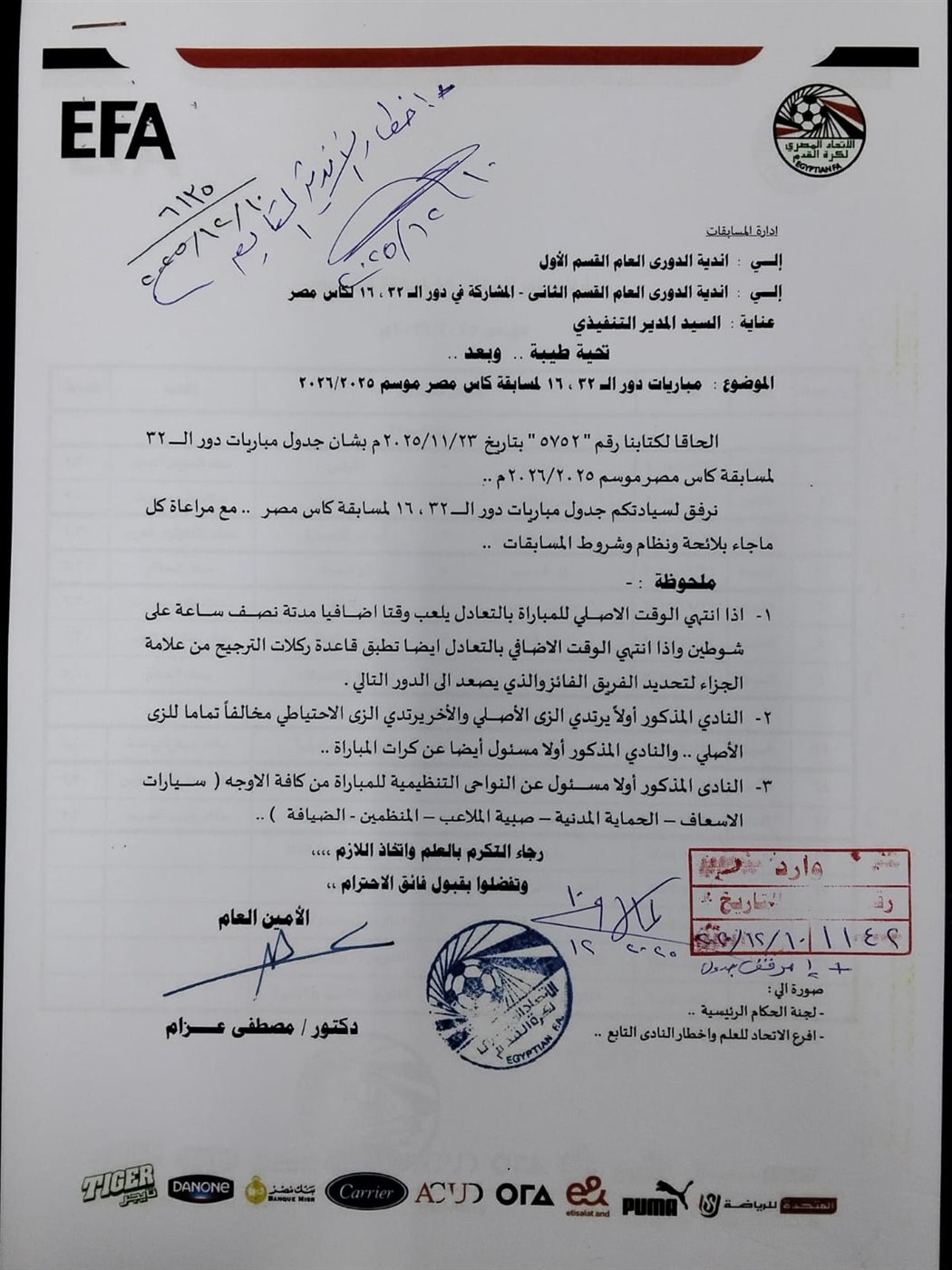 كأس مصر، أخطر الاتحاد المصري لكرة القدم، الأندية المشاركة في بطولة كأس مصر بمواعيد مباريات دور الـ32 ودور الـ16 في المسابقة الأقدم في مصر.