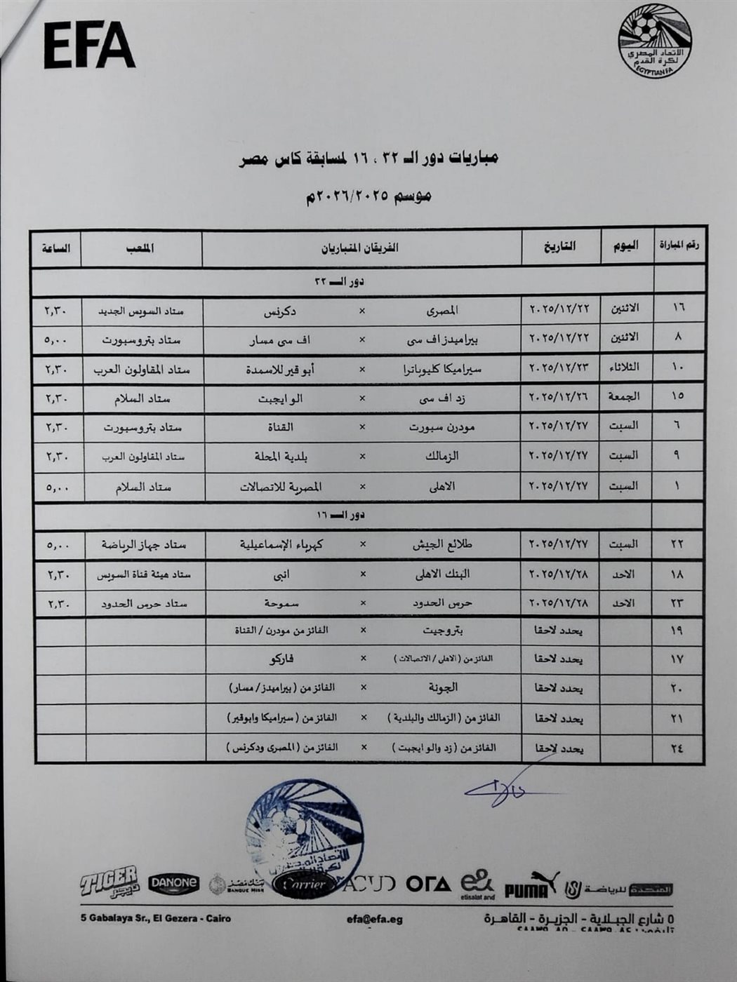 أما مباريات دور الستة عشر من مسابقة كأس مصر، فتنطلق على مدى يومي 27 و28 ديسمبر.