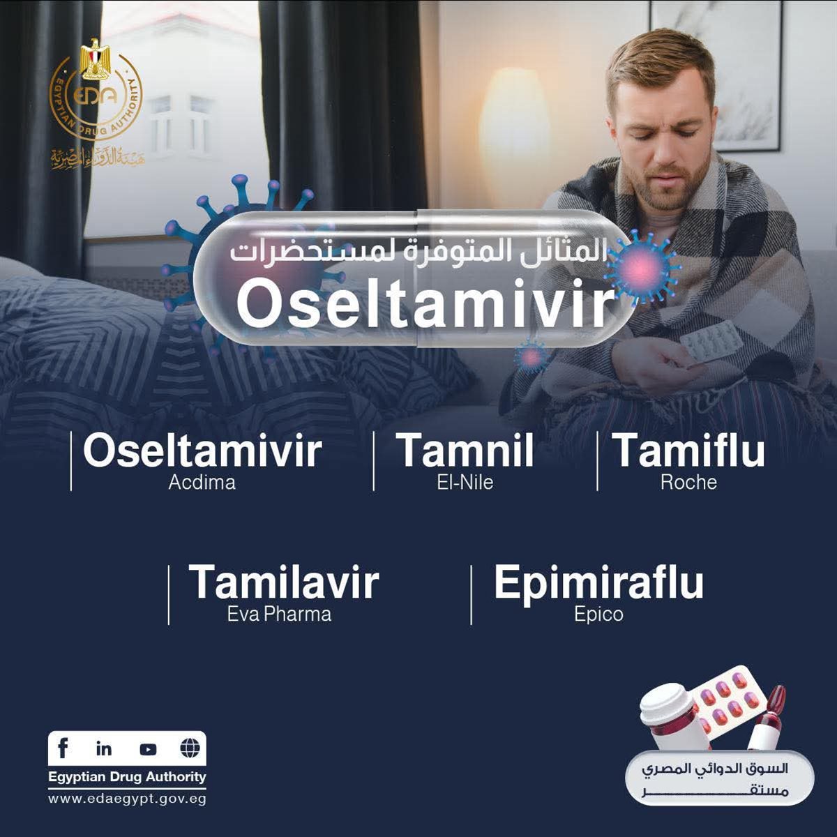 وأكدت هيئة الدواء توافر الدواء في السوق المصري بعدة أشكال دوائية، تشمل كبسولات 75 مجم، مسحوق لتحضير معلق فموي بتركيز 60 مجم/5 مل، وحبيبات لتحضير معلق بتركيز 12 مجم/مل، مشددة على أهمية استشارة الطبيب قبل الاستخدام، خاصة لدى الفئات الأكثر عرضة للمضاعفات ومرضى نقص المناعة.