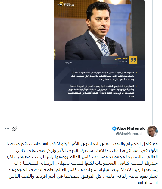 وتابع علاء مبارك رسالته لوزير الرياضة: "بالنسبة لـ مجموعة مصر في كأس العالم ووصفها بأنها ليست صعبة، بالتأكيد حضرتك ليست كباقي المجموعات لكنها ليست سهلة".