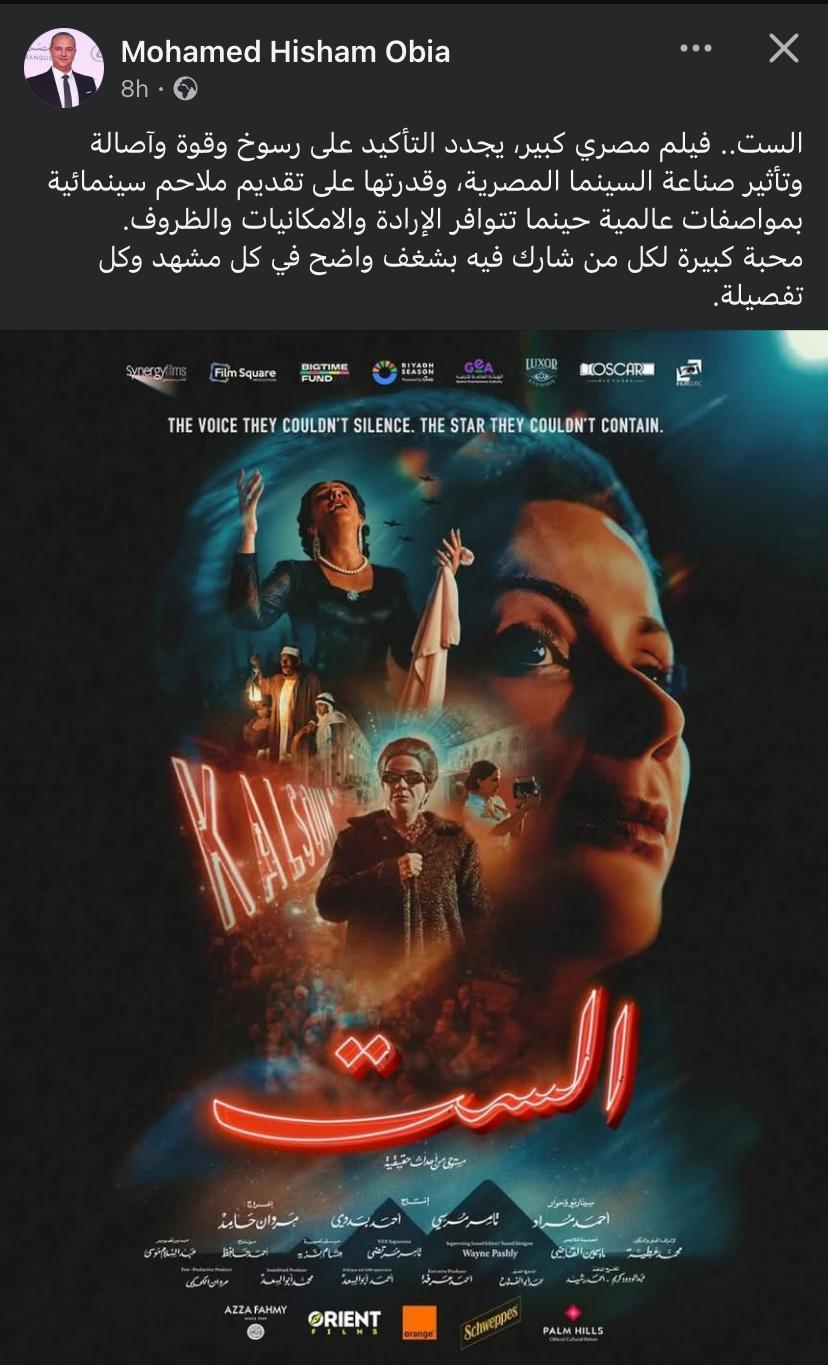 وكتب محمد هشام عبية قائلا: “الست.. فيلم مصري كبير، يجدد التأكيد على رسوخ وقوة وآصالة وتأثير صناعة السينما المصرية، وقدرتها على تقديم ملاحم سينمائية بمواصفات عالمية حينما تتوافر الإرادة والامكانيات والظروف”.