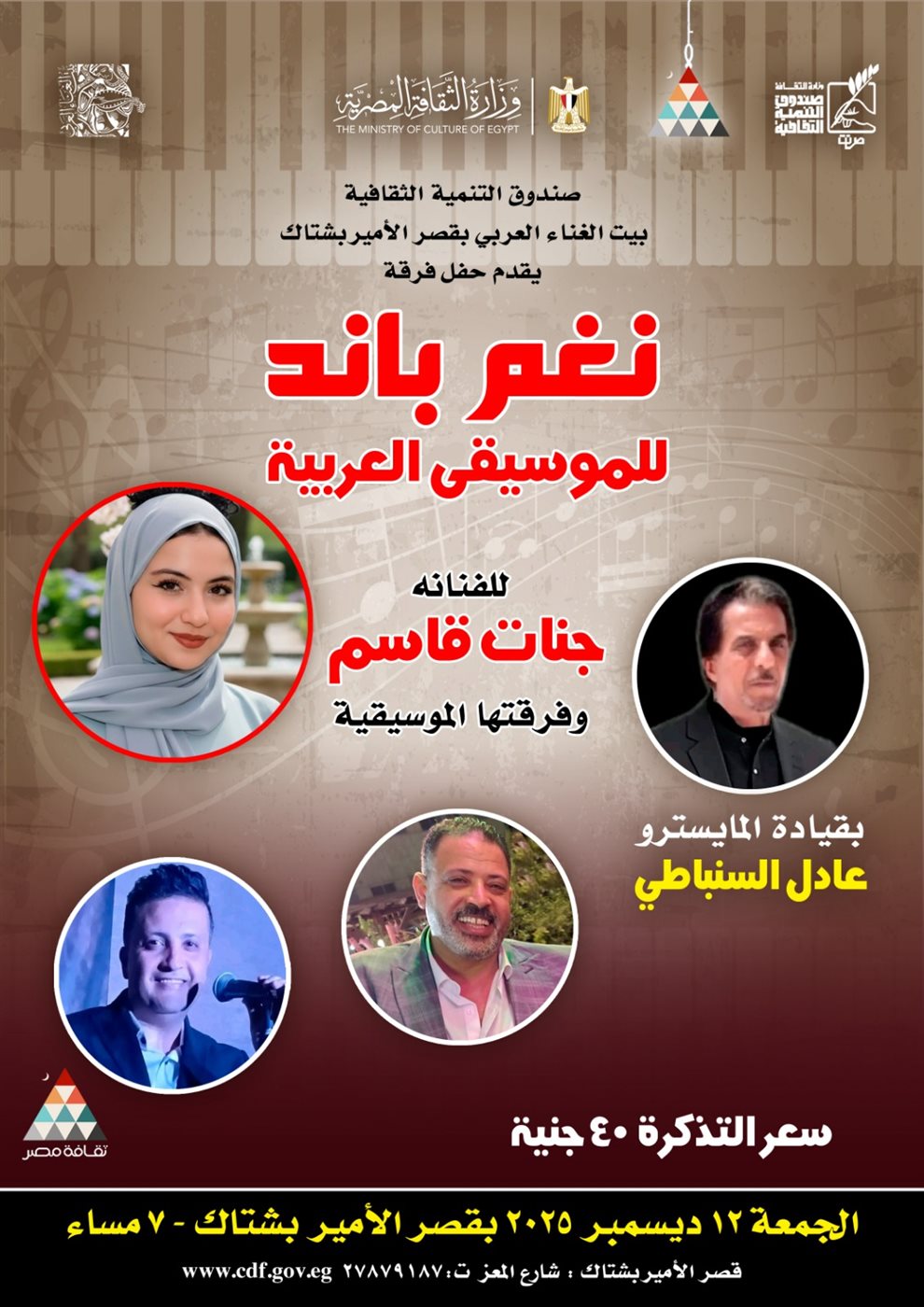 أعلن قطاع صندوق التنمية الثقافية برئاسة المعماري حمدي السطوحي عن إقامة في السابعة مساء غدًا الجمعة الموافق 12 ديسمبر حفل لفرقة "نغم باند" للموسيقى العربية بقيادة المايسترو عادل السنباطى، وذلك بمقر بيت الغناء العربى بشارع المعز.