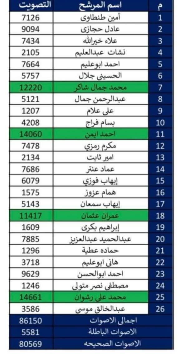 وأشارت نتائج الحصر العددي النهائية الي تقدم 4 مرشحين بعد عملية تجميع الأعداد القادمة من اللجان الفرعية، وخروج مدوي لمرشح الحزب الذي يحمل رقم 1 ودخول مستقل بدلا منه وخروج المرشح عادل حجازي أيضا مما يبدل المشهد تماما للانتخابات قبل وبعد الالغاء وجاءت النتيجة كالتالي