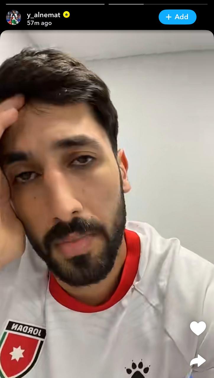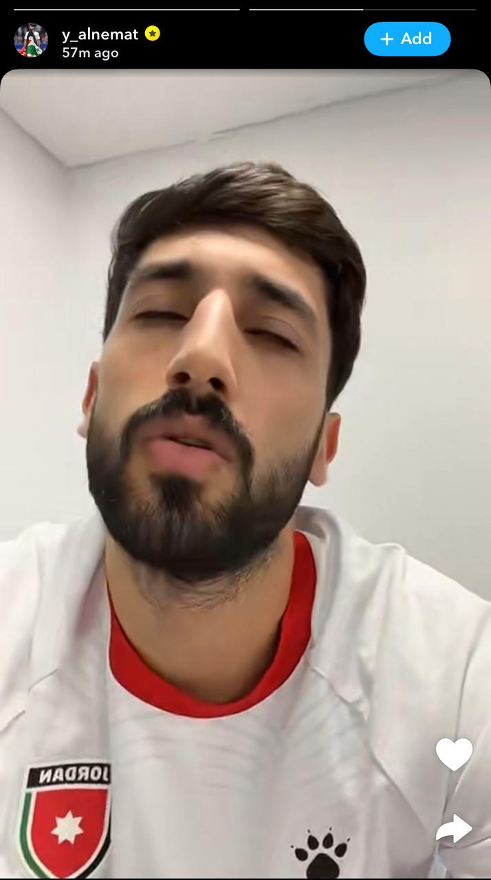 ونشر النعيمات ستوري عبر حسابه الشخصي على تطبيق "سناب شات"، دعا خلالها الجماهير إلى الاستمرار في دعم المنتخب، قائلا: "شجعوا رجال النشامى الأبطال سواء كنتم داخل الملعب أو خارجه، شجعوهم دائما."