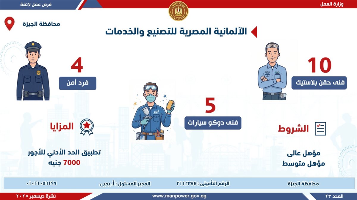 وتشمل الفرص المتاحة بشركة الآلمانية المصرية للتصنيع والخدمات عدد (10) فنيي حقن بلاستيك، و(5) فنيي دوكو سيارات، و(4) أفراد أمن، على أن يكون المتقدم حاصلًا على مؤهل فوق متوسط أو متوسط، وبراتب شهري 7000 جنيه، وللتواصل عبر رقم: 01021056199.