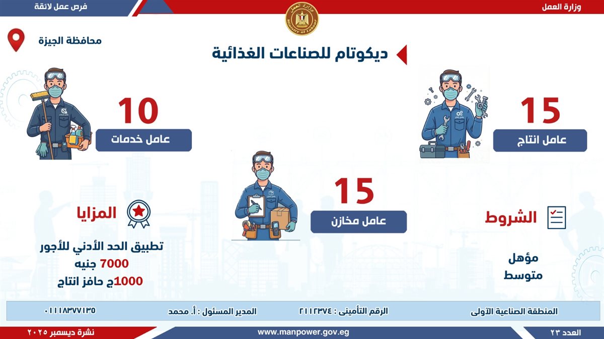 كما أعلنت الوزارة عن فرص عمل بشركة ديكوتام للصناعات الغذائية بالمنطقة الصناعية الأولى، تشمل (15) عامل إنتاج، و(15) عامل مخازن، و(10) عمال خدمات، براتب 7000 جنيه، بالإضافة إلى 1000 جنيه حافز إنتاج، وللتواصل عبر رقم: 01118377135.
