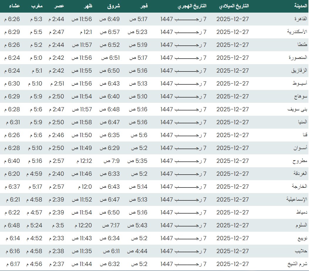 مواقيت الصلاة، موعد أذان الفجر اليوم السبت 27 - 12 - 2025 في القاهرة والمحافظات