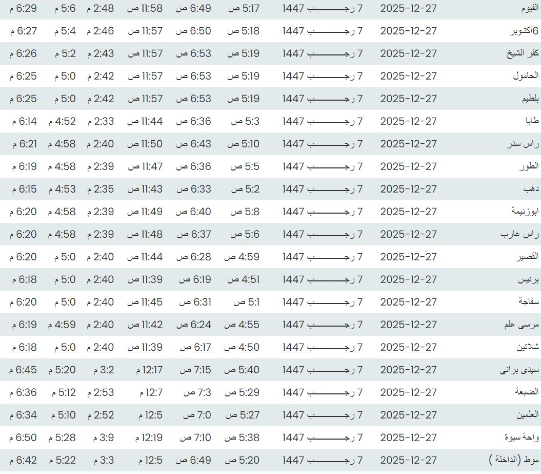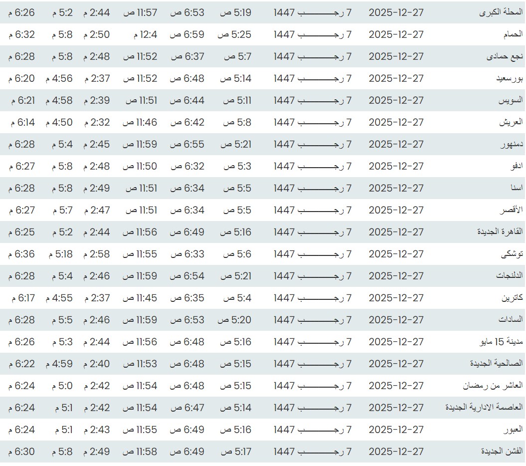 وفيما يلي مواقيت الصلاة، لعدد من مدن ومحافظات الجمهورية من واقع بيانات الهيئة العامة للمساحة