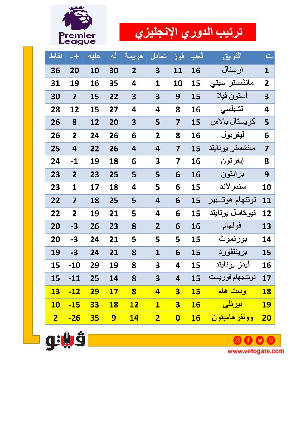الدوري الإنجليزي، يتصدر أرسنال قمة جدول ترتيب الدوري الإنجليزي برصيد 36 نقطة ويليه مانشستر سيتي في المركز الثاني برصيد 31 نقطة قبل مباريات اليوم الأحد في الجولة الـ 16 من البريميرليج.