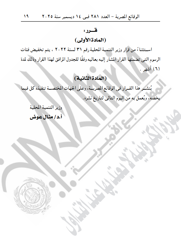 ونصت المادة الأولى لقرار وزارة التنمية المحلية على أنه "استثناءً من قرار وزير التنمية المحلية رقم ۳۱ لسنة 2022، يتم تخفيض فئات الرسوم التى تضمنها القرار وذلك لمدة (6) أشهر".