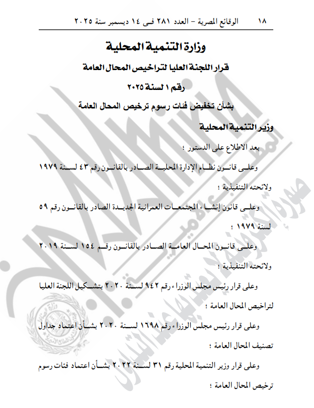 نشرت جريدة الوقائع المصرية في عددها رقم 281، الصادر في 14 ديسمبر 2025، قرار وزارة التنمية المحلية رقم 1 لسنة 2025،بشأن تخفيض فئات رسوم ترخيص المحال العامة.