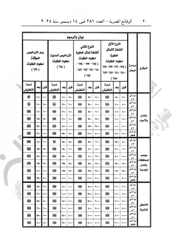 وجاء في القرار أن المحال الموجودة في نطاق المدن والأحياء يتراوح نسبة التخفيض فيها من 25% إلى 50%، وذلك حسب المساحة والمنطقة، أما المحال في عواصم المحافظات والمدن الجديدة فيكون نسبة التخفيض فيها من 50%، والأماكن المتميزة فتتراوح نسبة التخفيض من 50 إلى 65%.