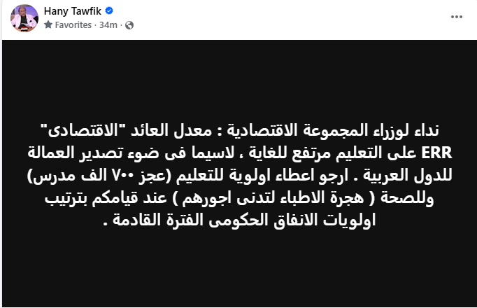 وقال توفيق، في تدوينة له عبر "الفيس بوك"، في ندائه الذي وجهه للمجموعة الاقتصادية بالحكومة: "نداء لوزراء المجموعة الاقتصادية: معدل العائد "الاقتصادى" ERR على التعليم مرتفع للغاية، لاسيما فى ضوء تصدير العمالة للدول العربية".