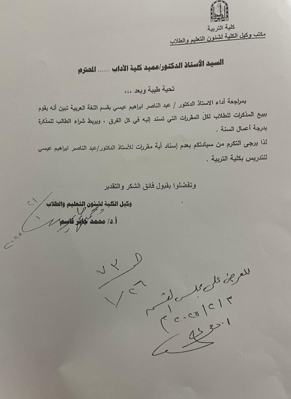 لذا يرجى التكرم من سيادتكم بعدم إسناد أية مقررات للأستاذ الدكتور / عبد الناصر إبراهيم عيسى للتدريس بكلية التربية.