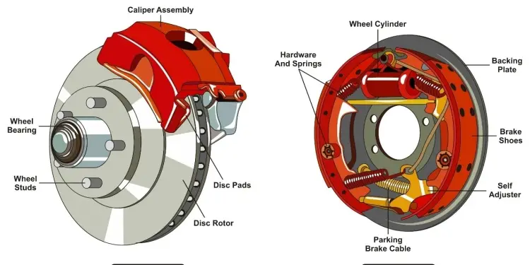 2- الاحتكاك: تضغط الملاقط على تيل الفرامل (الوسادات) ضد دوارات العجلات.