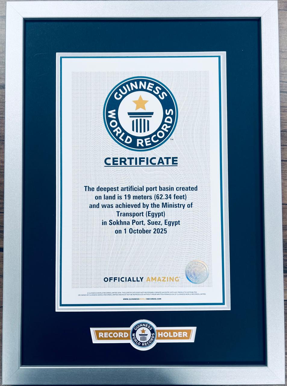 في إنجاز عالمي للموانيء المصرية يعكس حجم التطور الكبير الذي تشهده واستمرار لسلسة الانجازات التي تحققها الموانئ المصرية في مختلف التصنيفات العالمية تسلم الفريق مهندس كامل الوزير نائب رئيس مجلس الوزراء للتنمية الصناعية وزير الصناعة والنقل خلال زيارته لميناء السخنة من كانزي الدفراوي المحكم المعتمد لجينيس للأرقام القياسية شهادة موسوعة جينيس للأرقام القياسية لـ ميناء السخنة كأعمق حوض ميناء من صنع الإنسان، ينشأ على اليابسة بعمق 19 م.