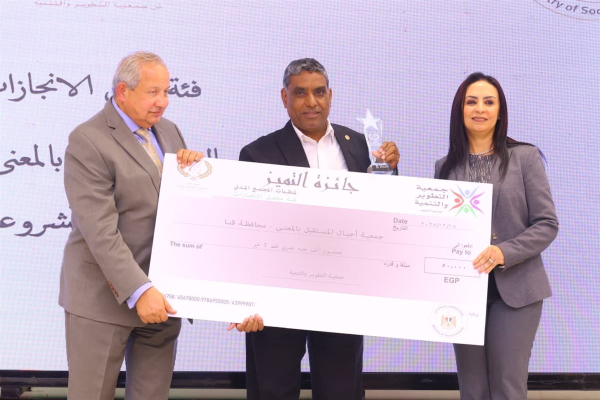 وفي فئة جائزة التميز عن مجمل الإنجازات — وهي فئة جديدة تُطلق لأول مرة هذا العام بهدف تكريم الجمعيات ذات التاريخ الطويل في العمل التنموي والمبني على شبكة قوية من المتطوعين — فازت جمعيةاجيال المستقبل بالمعنى محافظة قنا بجائزة مالية تقديرًا لمسيرتها وإسهاماتها الممتدة في خدمة المجتمع.