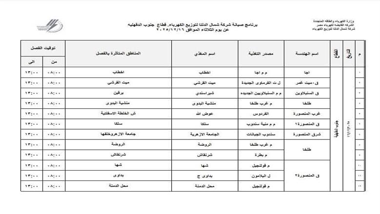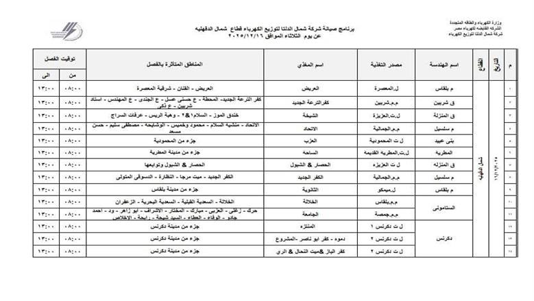 قطع الكهرباء في محافظة الدقهلية في جنوب الدقهلية «في مركز أجا ومركز ميت غمر ومركز السنبلاوين ومركز طلخا ومنطقة غرب المنصورة وقسم المنصورة 1 وشرق المنصورة، وطلخا، وقسم المنصورة 2»، وشمال الدقهلية «بلقاس وشربين والمنزلة وميت سلسيل وبني عبيد والمطرية والمنزلة والستاموني، ودكرنس».