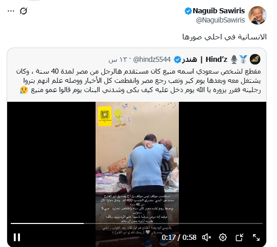 علق رجل الأعمال نجيب ساويرس على اللحظة المؤثرة التي كشف عنها بعض النشطاء، عندما قدم أحد السعوديين إلى مصر، لزيارة مسن مصري كان يعمل معه لمدة 40 عامًا، لكن المسن المصري عاد لمصر وتعرض لوعكة صحية، وكانت لحظة مؤثرة عندما رآه المسن المصري.