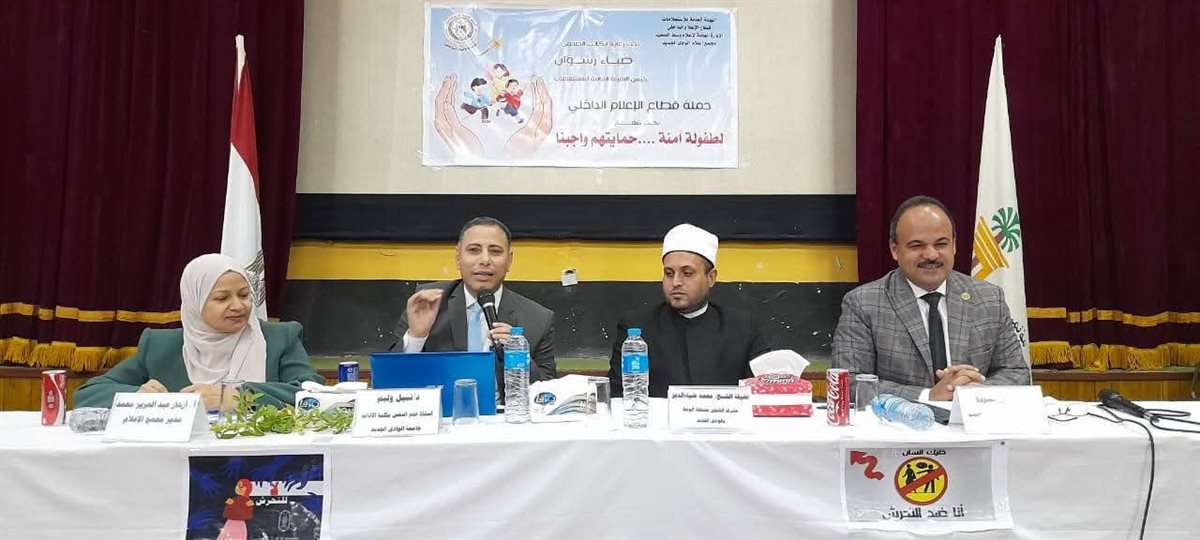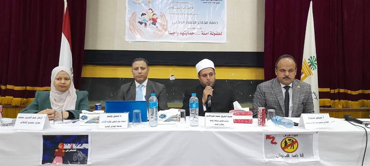 عقد مجمع إعلام الوادى الجديد اليوم الثلاثاء، ندوة موسعة شارك فيها عدد كبير من مؤسسات المجتمع المدنى والمؤسسات الدينية والتربوية والعاملين بالمصالح والدواوين الحكومية ومكلفات الخدمة العامة، وذلك فى إطار حملة قطاع الإعلام الداخلى للتصدى لظاهرة التحرش ضد الاطفال تحت شعار (حمايتهم واجبنا) برعاية الكاتب الصحفى ضياء رشوان رئيس الهيئة العامة للاستعلامات وتوجيهات دكتور أحمد يحيى رئيس القطاع واشراف السيد حمدى سعيد رئيس الإدارة المركزية لإعلام شمال ووسط الصعيد.