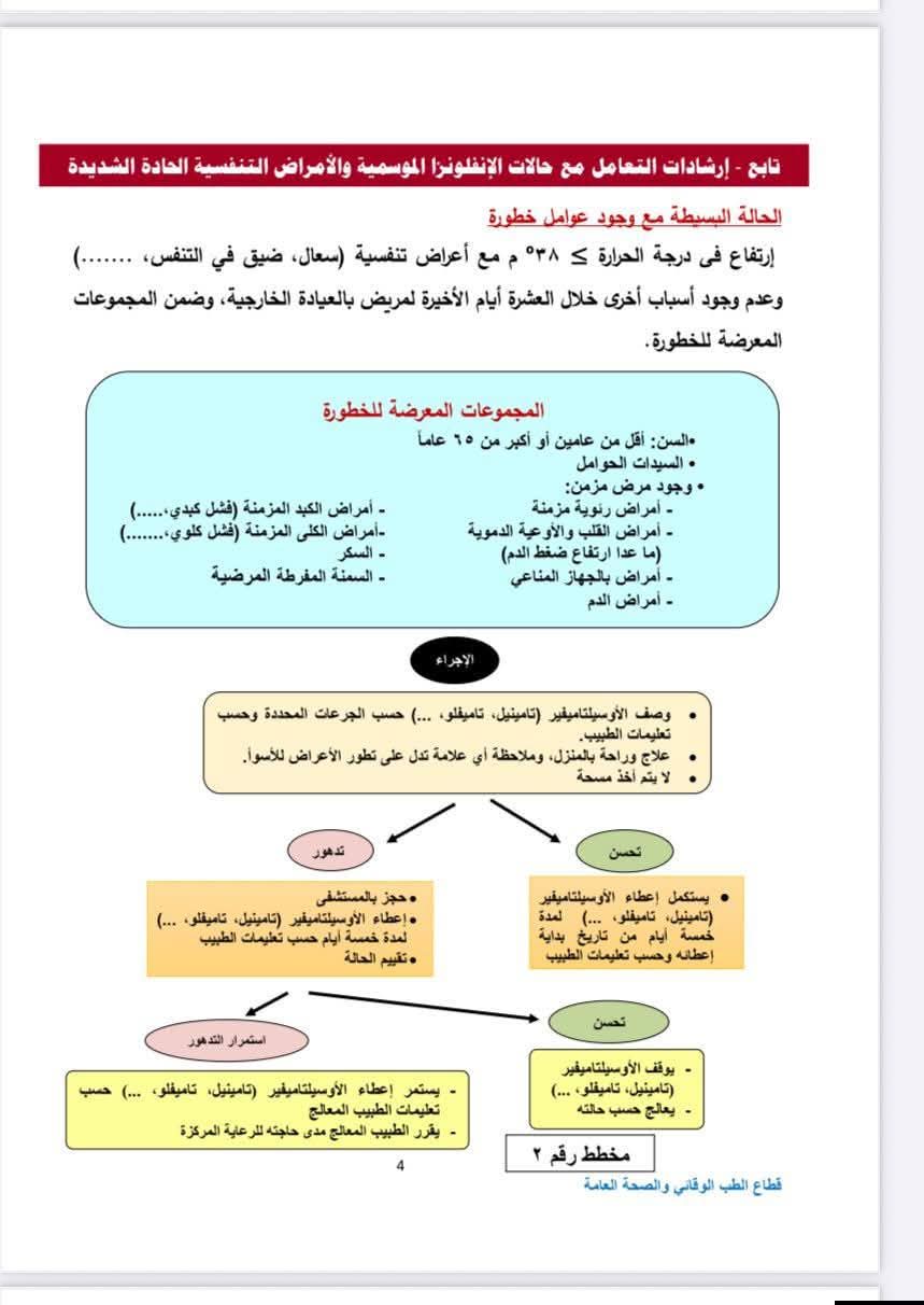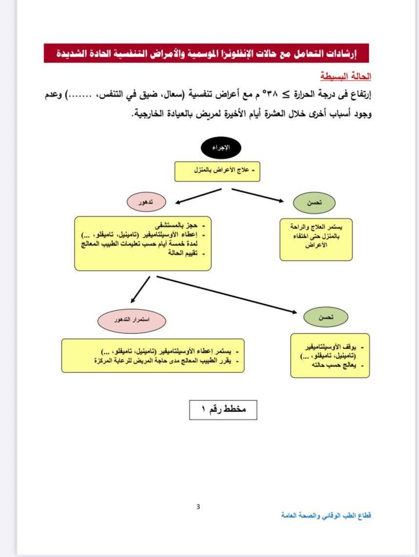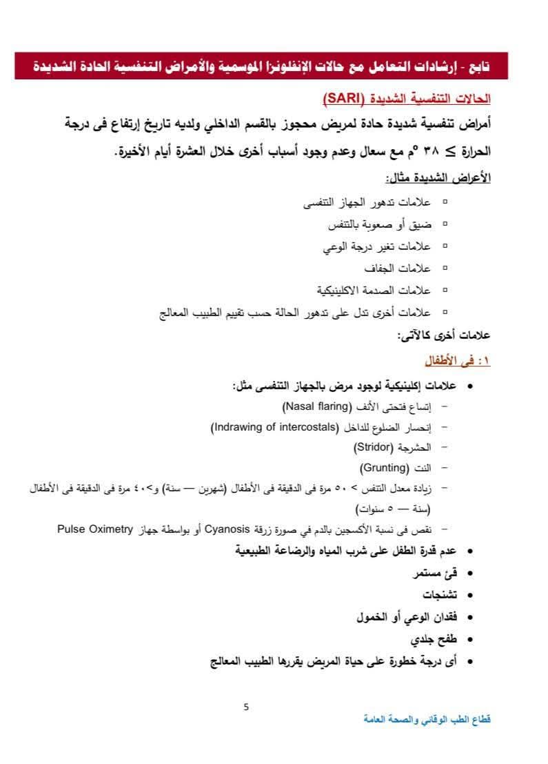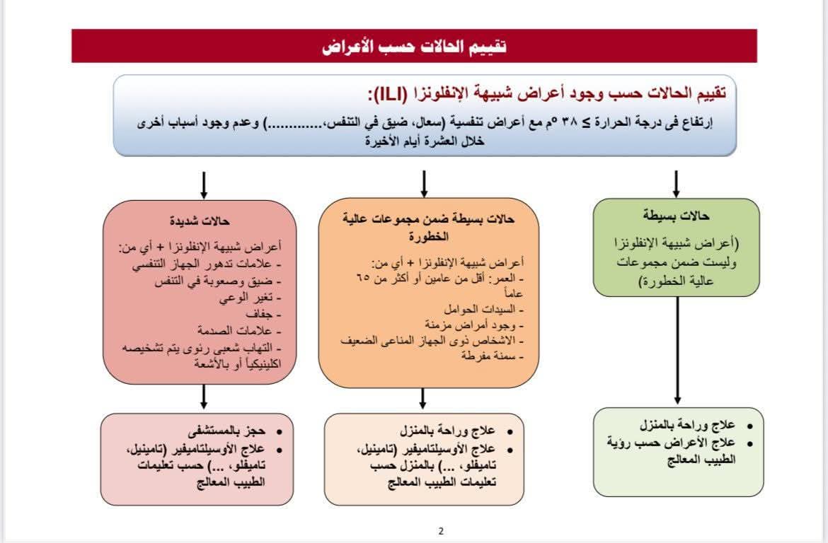 وتتضمن الإرشادات تصنيف الحالات وفق شدة الأعراض ووجود عوامل خطورة، مع تحديد مسارات التعامل المناسبة لكل فئة، بدءًا من العلاج المنزلي للحالات البسيطة، مرورًا بإعطاء العلاج اللازم وإجراء الفحوصات عند الحاجة، وصولًا إلى إدخال المستشفى للحالات الشديدة أو الحرجة، بما في ذلك حالات الالتهاب التنفسي الحاد الشديد (SARI).