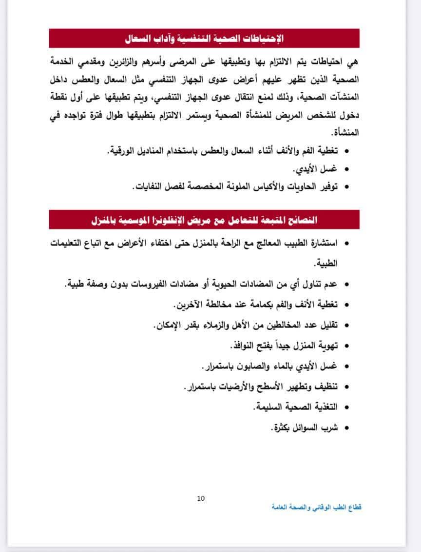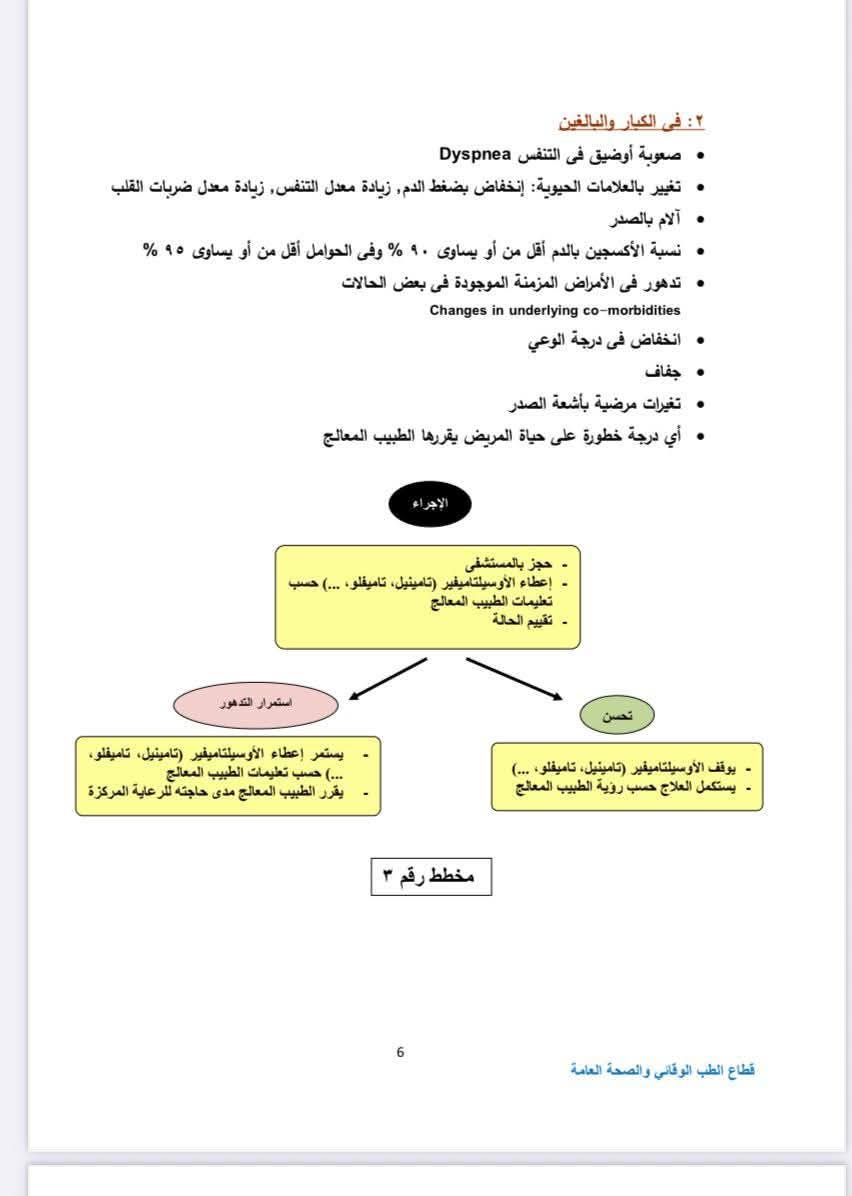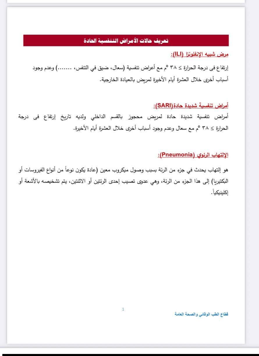 وتتضمن الإرشادات تصنيف الحالات وفق شدة الأعراض ووجود عوامل خطورة، مع تحديد مسارات التعامل المناسبة لكل فئة، بدءًا من العلاج المنزلي للحالات البسيطة، مرورًا بإعطاء العلاج اللازم وإجراء الفحوصات عند الحاجة، وصولًا إلى إدخال المستشفى للحالات الشديدة أو الحرجة، بما في ذلك حالات الالتهاب التنفسي الحاد الشديد (SARI).